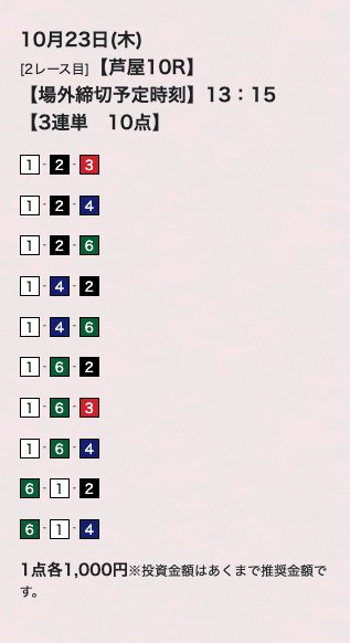 | 10月23日 | 芦屋10R | 三連単 | 10点 | 19,200円 |