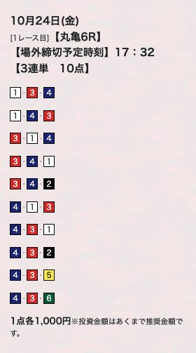 | 10月24日 | 丸亀6R | 三連単 | 10点 | 0円 |