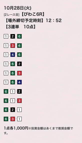 | 10月28日 | びわこ6R | 三連単 | 10点 | 18,200円 |