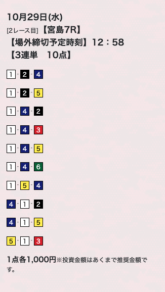 | 10月29日 | 宮島7R | 三連単 | 10点 | 12,700円 |