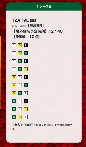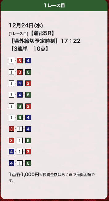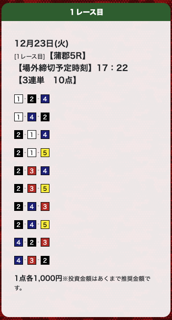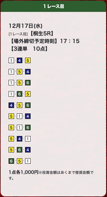 | 12月17日 | 桐生5R | 三連単 | 10点 | 21,700円 |