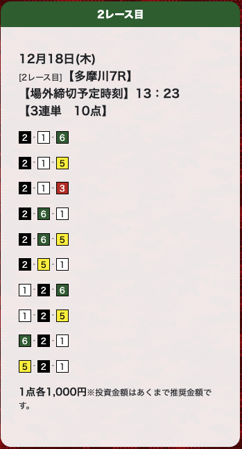 | 12月18日 | 多摩川7R | 三連単 | 10点 | 13,300円 |