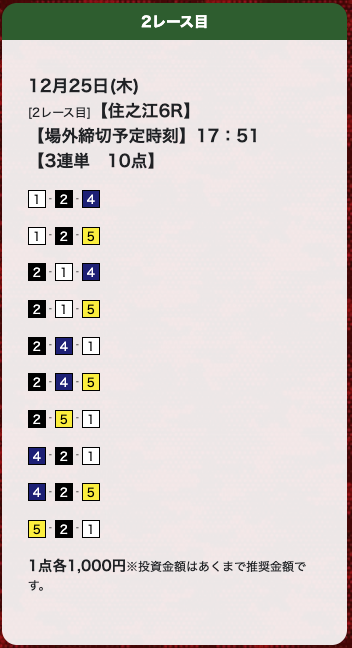 | 12月25日 | 住之江6R | 三連単 | 10点 | 13,000円 |