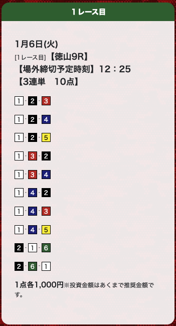 | 1月6日 | 徳山9R | 三連単 | 10点 | 0円 |