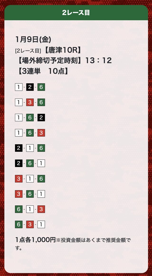 | 1月9日 | 唐津10R | 三連単 | 10点 | 13,600円 |