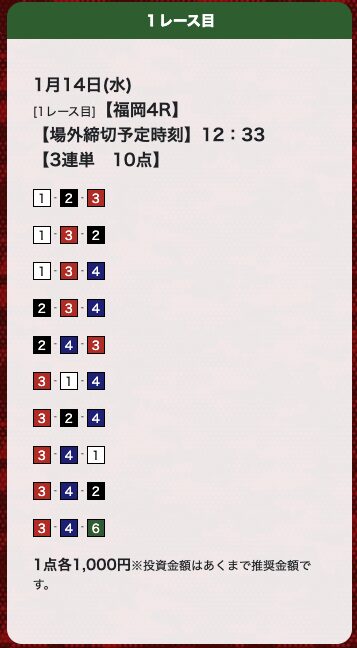 | 1月14日 | 福岡4R | 三連単 | 10点 | 22,000円 |
