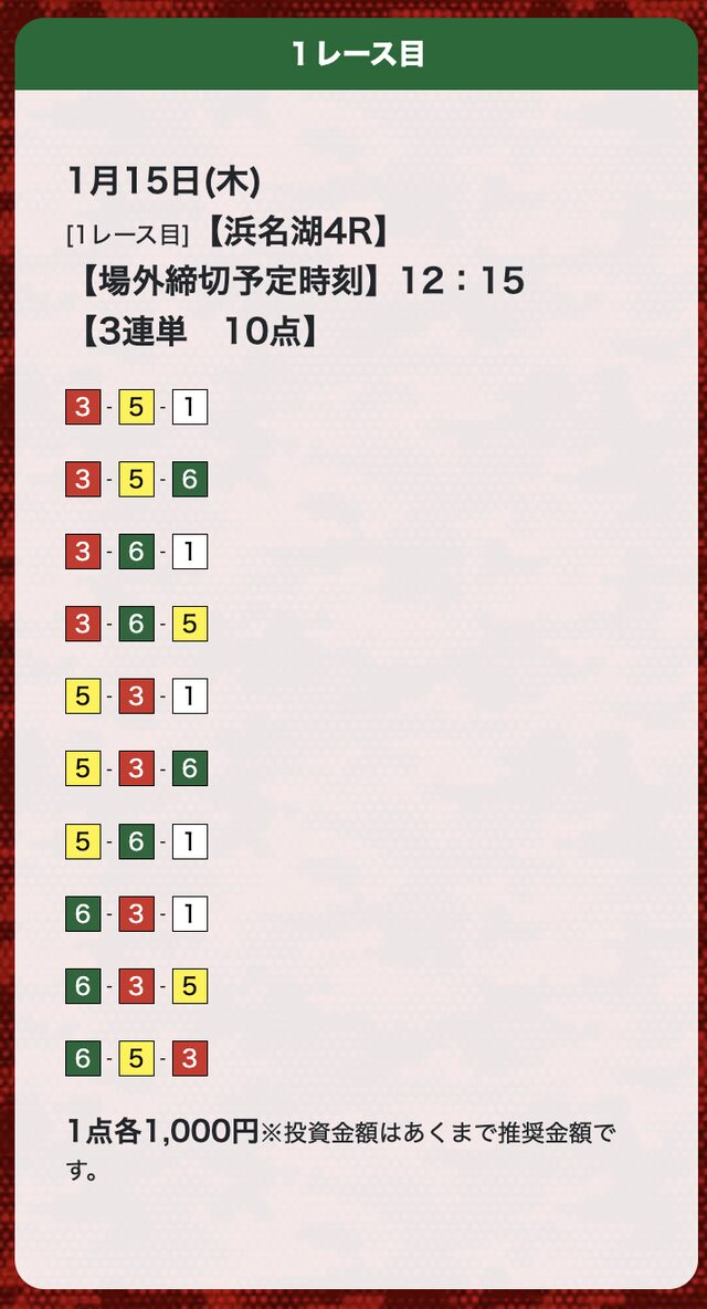 | 1月15日 | 浜名湖4R | 三連単 | 10点 | 45,900円 |