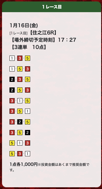 | 1月16日 | 住之江6R | 三連単 | 10点 | 11,200円 |