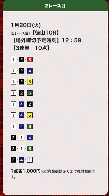 | 1月20日 | 徳山10R | 三連単 | 10点 | 0円 |
