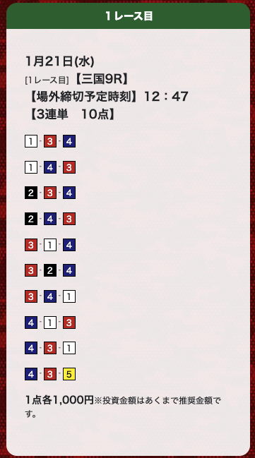 | 1月21日 | 三国9R | 三連単 | 10点 | 17,900円 |