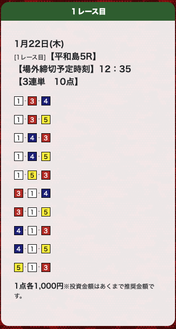 | 1月22日 | 平和島5R | 三連単 | 10点 | 15,000円 |