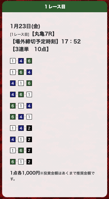 | 1月23日 | 丸亀7R | 三連単 | 10点 | 29,500円 |