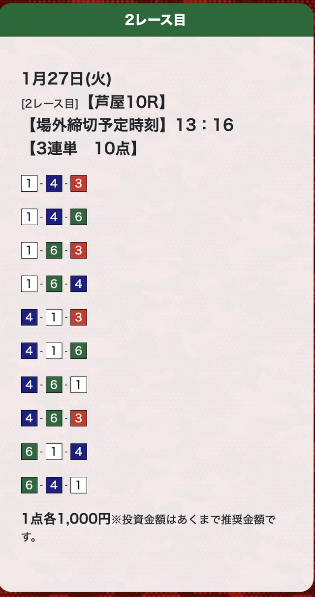 | 1月27日 | 芦屋10R | 三連単 | 10点 | 17,700円 |
