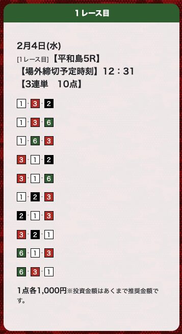 | 25年10月3日 | 平和島5R | 三連単 | 10点 | 29,900円 |