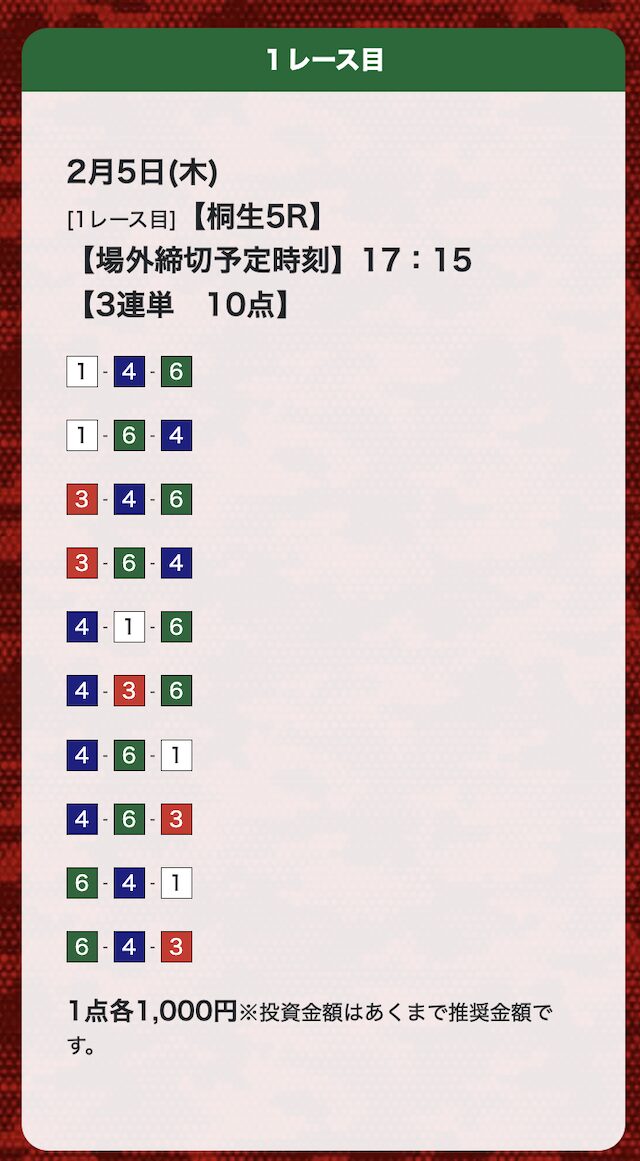 | 25年12月17日 | 桐生5R | 三連単 | 10点 | 21,700円 |