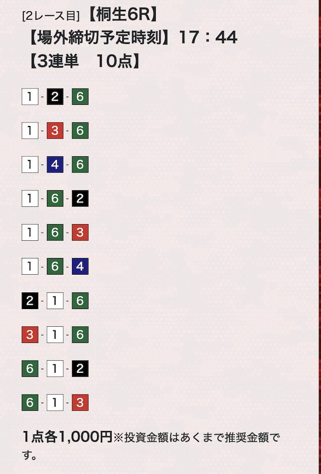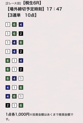 | 25年10月8日 | 桐生6R | 三連単 | 10点 | 18,700円 |