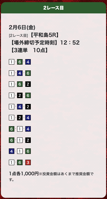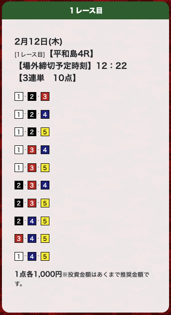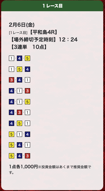 | 26年2月12日 | 平和島4R | 三連単 | 10点 | 10,300円 |