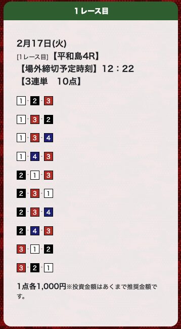 | 26年2月17日 | 平和島4R | 三連単 | 10点 | 0円 |