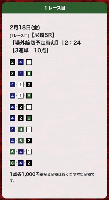 | 26年2月18日 | 尼崎5R | 三連単 | 10点 | 20,300円 |