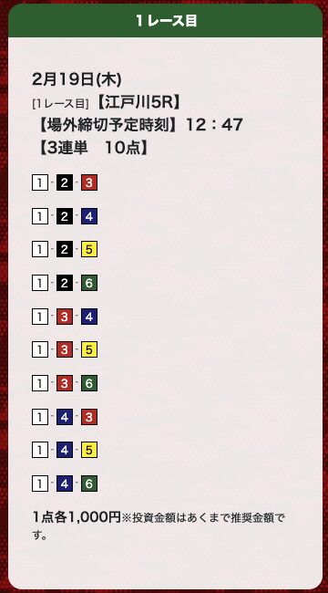 | 26年2月19日 | 江戸川5R | 三連単 | 10点 | 14,700円 |