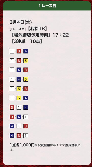 | 26年3月4日 | 若松1R | 三連単 | 10点 | 12,800円 |