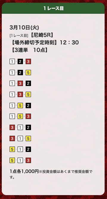 | 26年3月10日 | 尼崎5R | 三連単 | 10点 | 11,700円 |