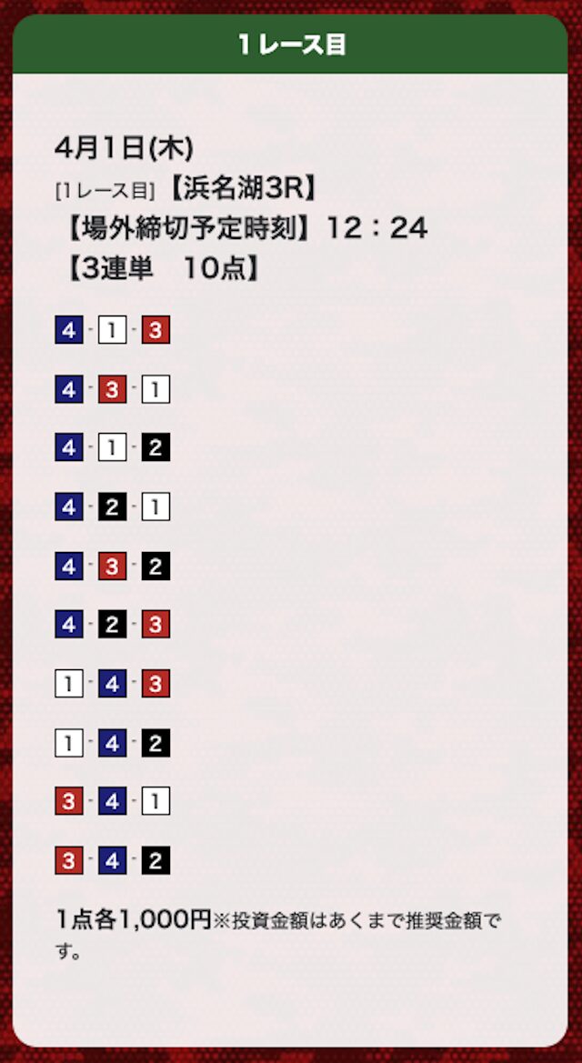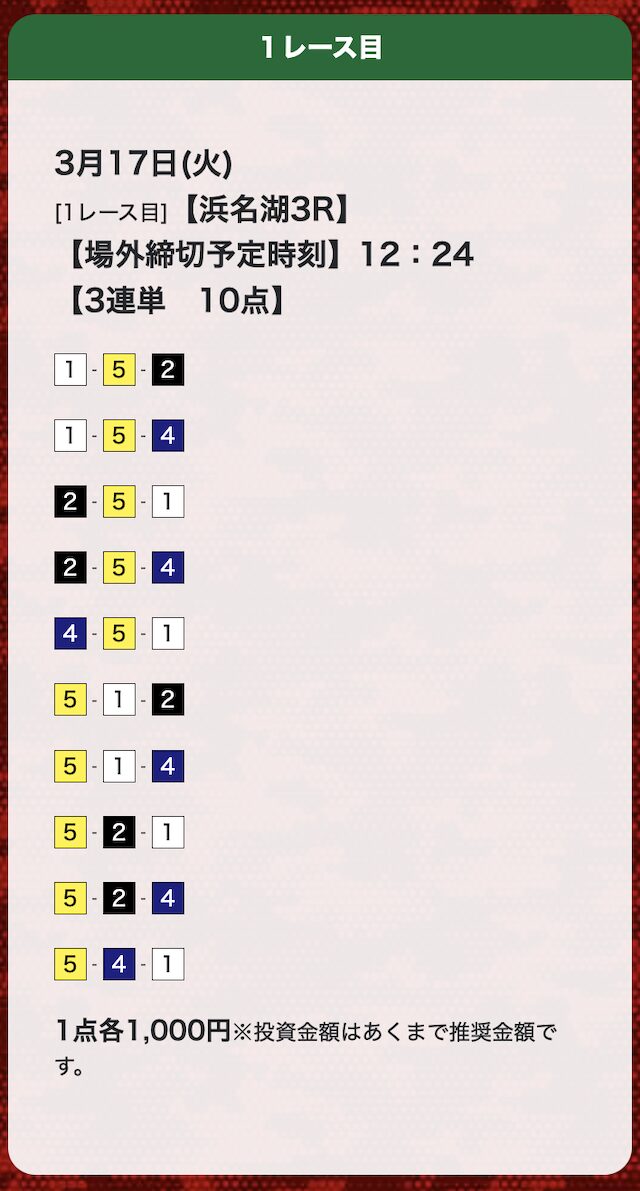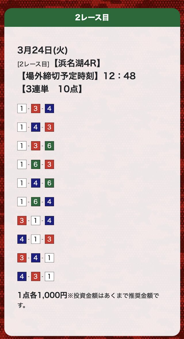 | 26年3月24日 | 浜名湖4R | 三連単 | 10点 | 25,700円 |
