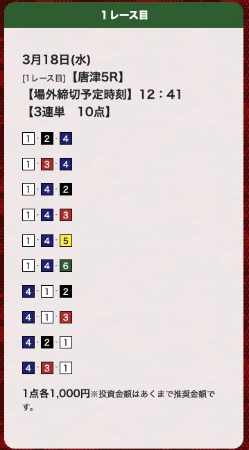 | 26年3月18日 | 唐津5R | 三連単 | 10点 | 0円 |