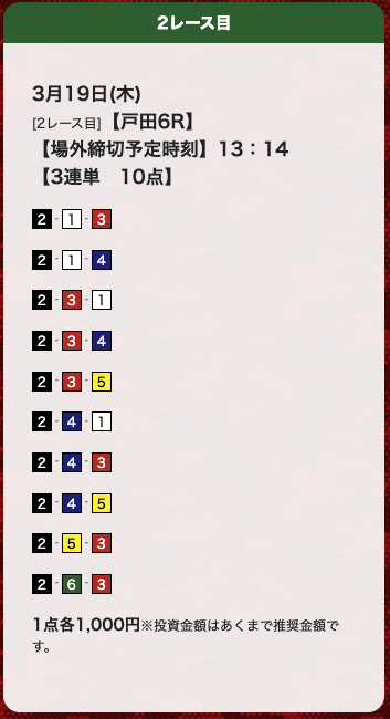 | 26年3月19日 | 戸田6R | 三連単 | 10点 | 26,200円 |