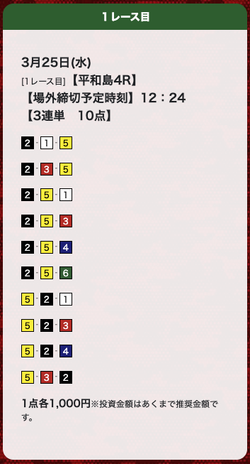 | 26年3月25日 | 平和島4R | 三連単 | 10点 | 0円 |