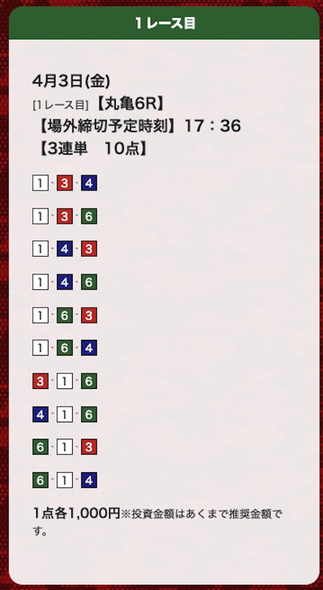 | 26年4月3日 | 丸亀6R | 三連単 | 10点 | 13,600円 |