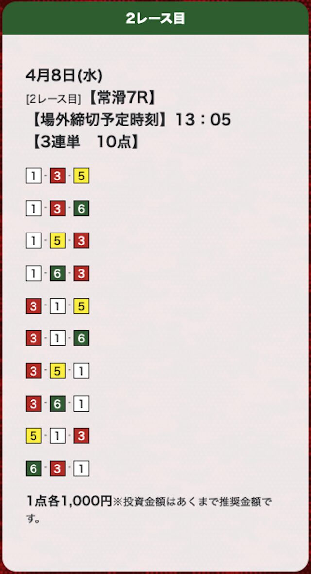 | 26年4月8日 | 常滑7R | 三連単 | 10点 | 43,900円 |