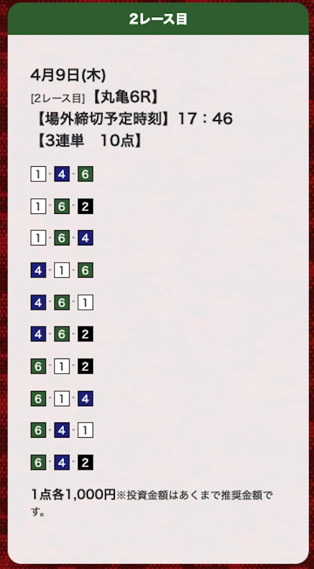 | 26年4月9日 | 丸亀6R | 三連単 | 10点 | 24,200円 |