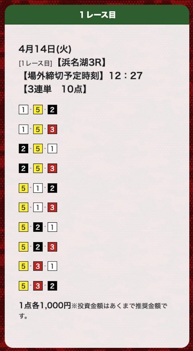 | 26年4月14日 | 浜名湖3R | 三連単 | 10点 | 13,300円 |