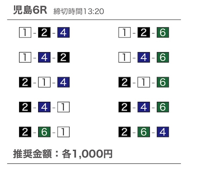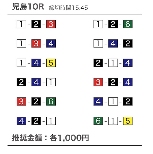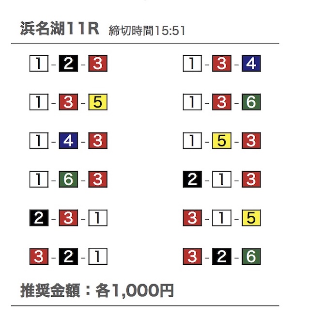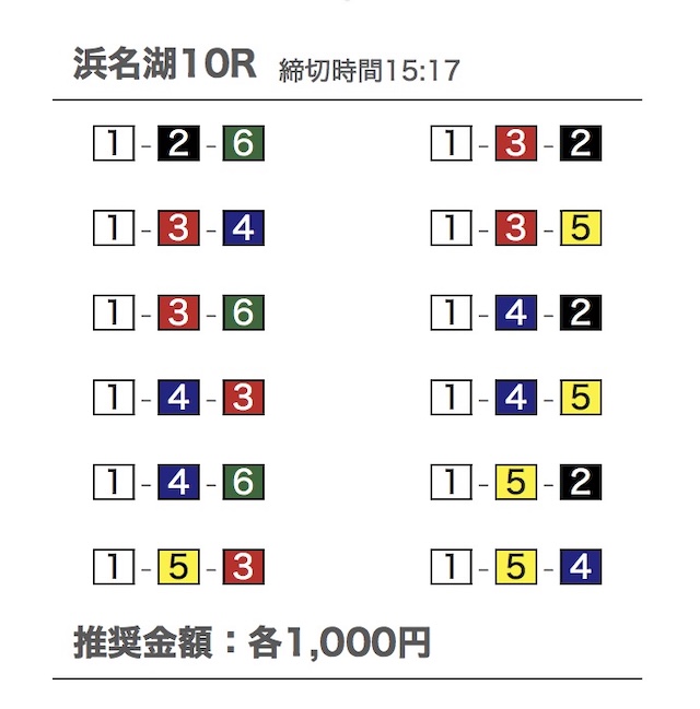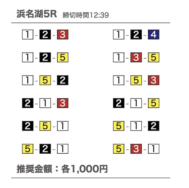 6月5日 | 浜名湖10R | 三連単 | 12点 | 69,900円 |