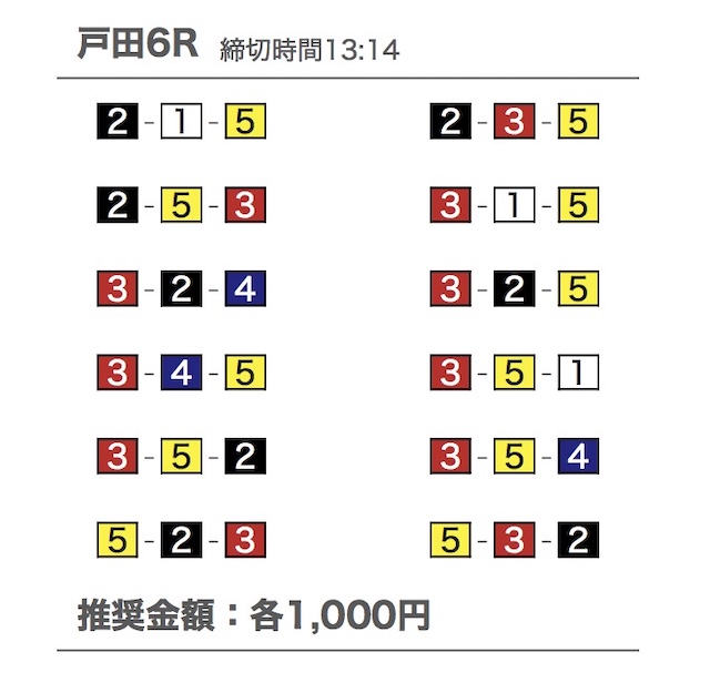 6月9日 | 津5R | 三連単 | 12点 | 61,700円 |