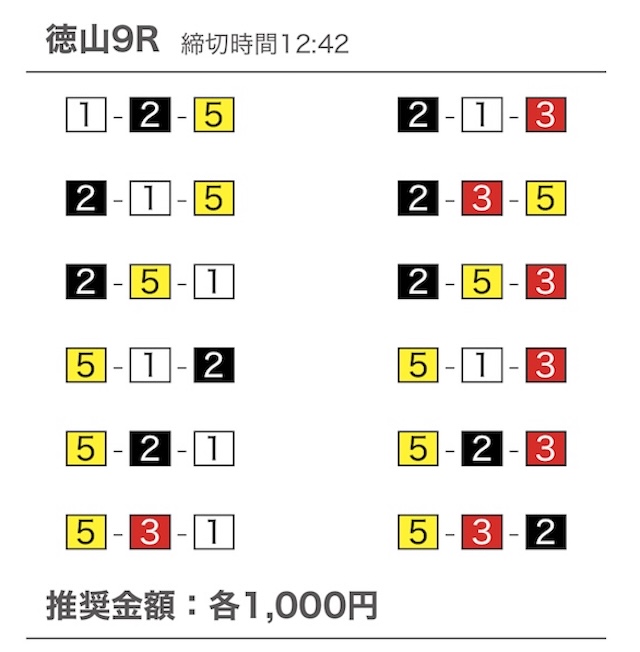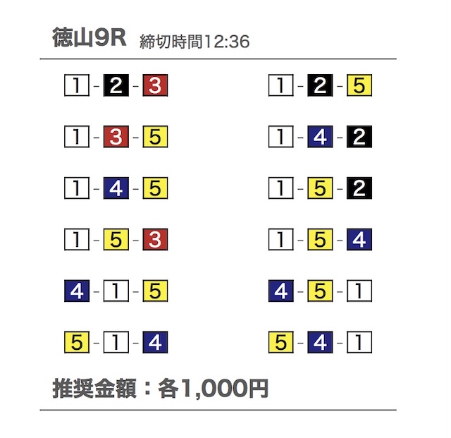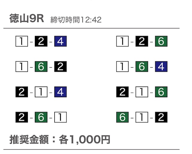 8月12日 | 徳山9R | 三連単 | 12点 | 22,700円 |