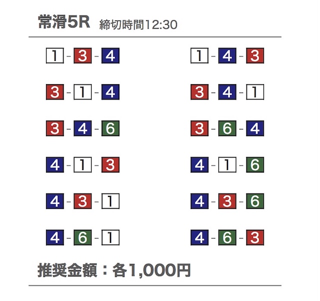 3月25日 | 常滑5R | 三連単 | 12点 | 21,400円 |