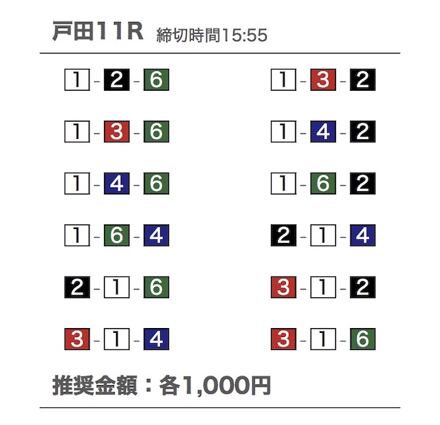 6月30日 | 桐生2R | 三連単 | 12点 | 31,000円 |