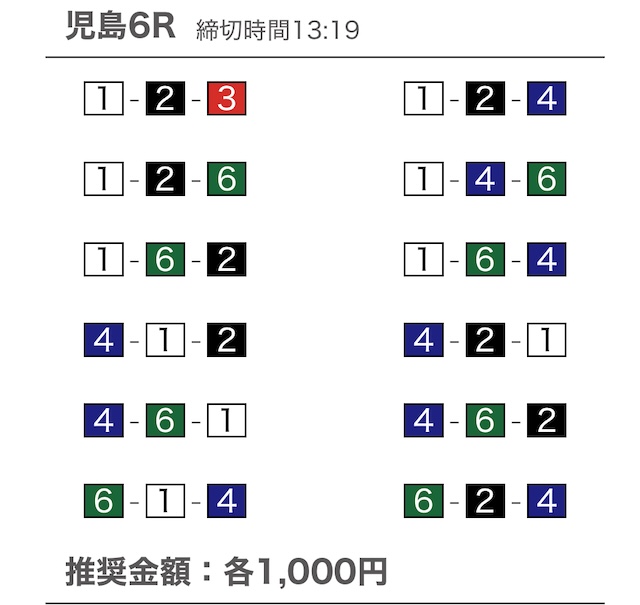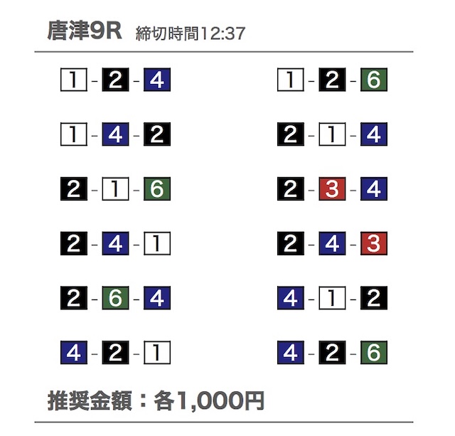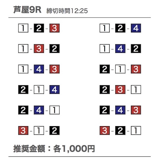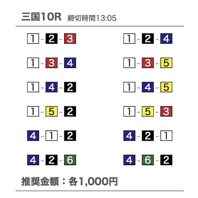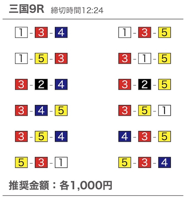 6月24日 | 三国9R | 三連単 | 12点 | 19,000円 |