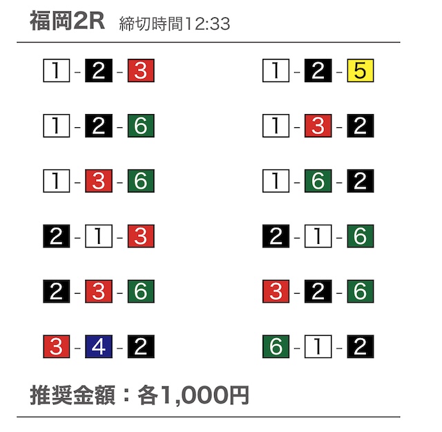 7月28日 | 福岡2R | 三連単 | 12点 | 36,000円 |