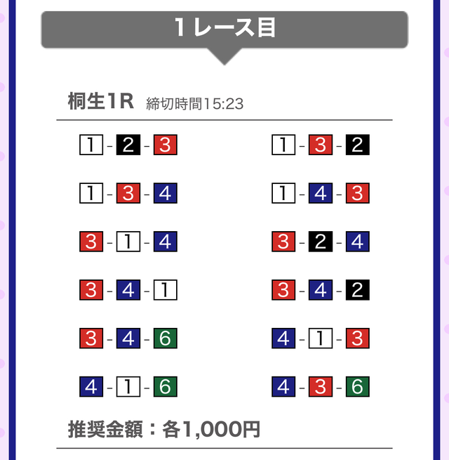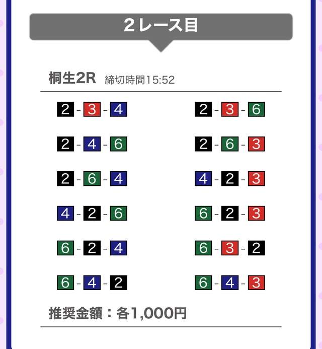 | 6月30日 | 桐生2R | 三連単 | 12点 | 31,000円 |