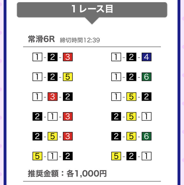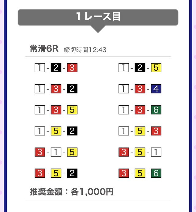 | 12月5日 | 常滑6R | 三連単 | 12点 | 29,700円 |