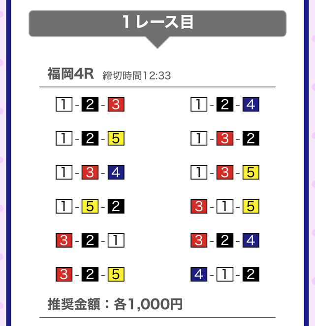 | 11月7日 | 福岡5R | 三連単 | 12点 | 25,700円 |