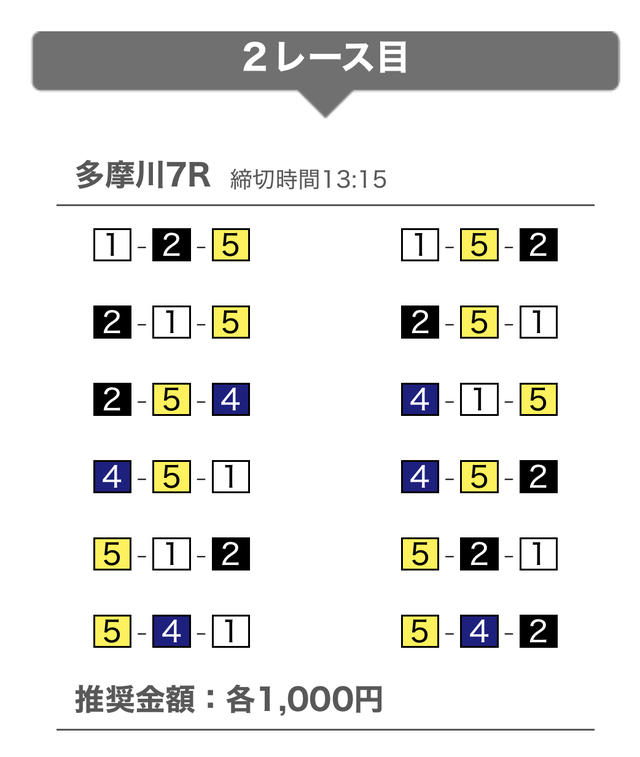 | 7月25日 | 多摩川7R | 三連単 | 12点 | 16,600円 |