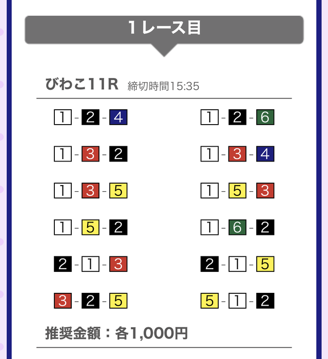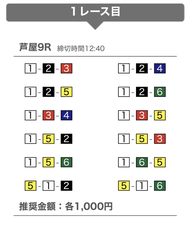 | 8月29日 | 三国9R | 三連単 | 12点 | 112,000円 |