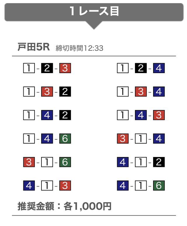 | 12月2日 | 戸田6R | 三連単 | 12点 | 17,500円 |