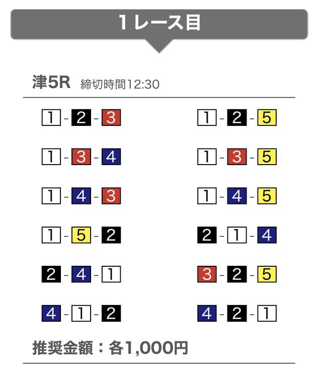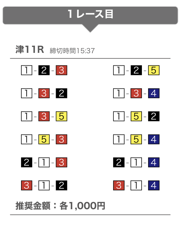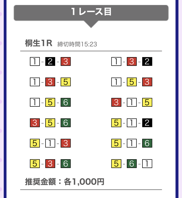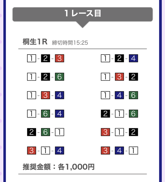 | 1月16日 | 桐生1R | 三連単 | 12点 | 38,100円 |