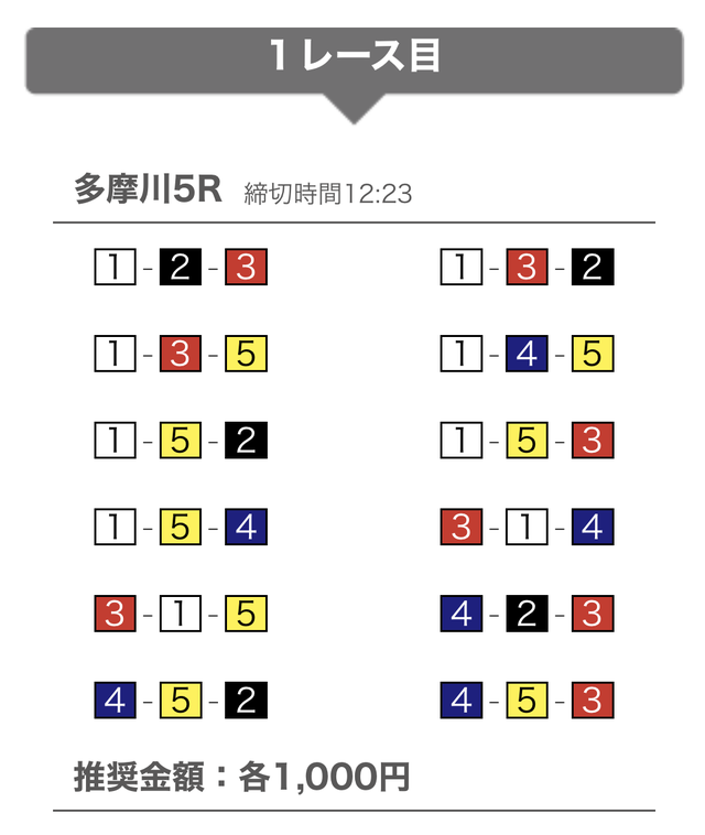 | 12月1日 | 多摩川7R | 三連単 | 12点 | 45,900円 |