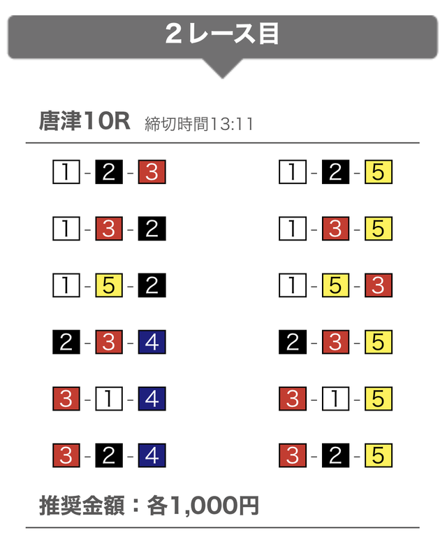 | 10月23日 | 福岡5R | 三連単 | 12点 | 13,500円 |